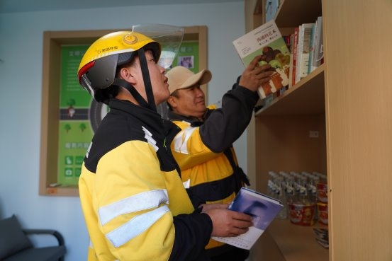 活动伊始,快递小哥们参观了新落成的“南骑士”邻+驿站。驿站配有紧急医药箱、维修工具箱、丰富的书籍、饮用水及微波炉等设施,设置了休息区、充电区、读书区和留言簿,成为小哥们可靠的“加油站”和“避风港”。